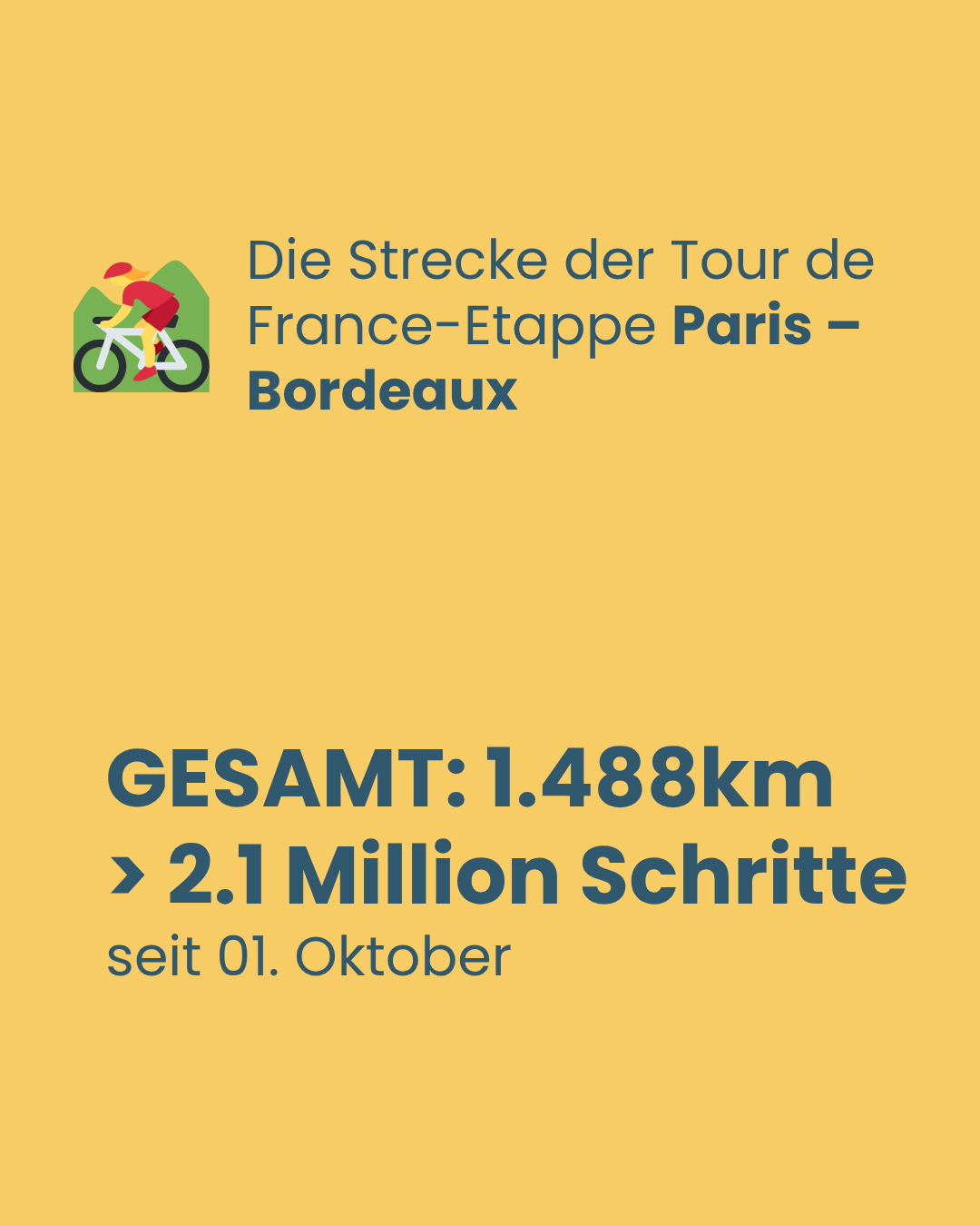 Unsere Gemeinschaft hat in einer Woche gemeinsam so viele Kilometer zurückgelegt wie eine komplette Tour de France-Etappe von Paris nach Bordeaux! 🇫🇷🚴‍♀️